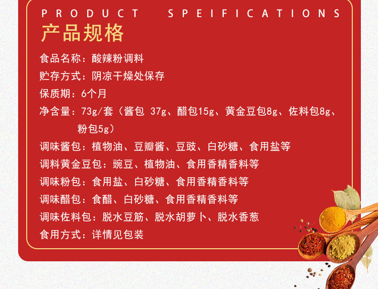 "產(chǎn)品配置(醬包37g、醋包15g、黃金豆8g、做料包8g、粉包5g)