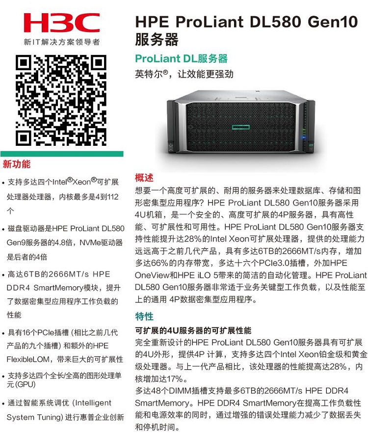 完全重新設計的HPE ProLiant DL580 Gen10服務器具有可擴展的4U外形,提供4P 計算,支持多達四個Intel Xeon鉑金級和黃金級處理器。與上一代產品相比,該處理器的性能提高達28%,內核增加達17%。多達48個DIMM插槽支持多達6TB的2666MT/s HPE DDR4SmartMemory。HPE DDR4 SmartMemory在提高工作負載性能和電源效率的同時,通過增強的錯誤處理能力減少了數據丟失和停機時間。