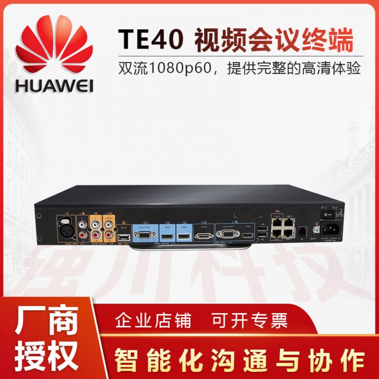 華為TE40是新一代商務型全高清視頻會議終端。強大的性能提供雙路1080P60高清畫面和AAC-LD寬頻語音,帶來面對面溝通體驗;Wi-Fi互聯、無線數據共享,減少連線,便于會議室部署和使用,是中小型視頻會議建設的更好選擇。