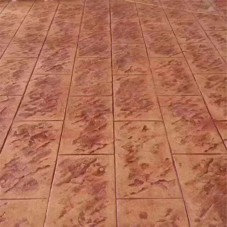 5、使用藝術地坪模具對地坪面層進行紋理處理。藝術地坪模具應配套使用,首先確定好紋理的分布方向,選好一塊模具放置的位置和角度,然后其它的模具依次緊貼一塊模具放置。彩色混凝土藝術地坪壓模采用壓模,壓模應由技術較好的人員進行作業以保證壓紋深度一致和模具放置的準確性。