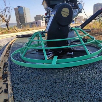透水混凝土屬干性混凝土料,其初凝快,攤鋪必須及時。對于人行道面,大面積施工采用分倉方式進行攤鋪,其松鋪系數為1.1。將混合物均勻攤鋪在工作面上,用刮尺找準平整度和控制一定的泛水度,用抹刀抹平,抹合不能有明水。