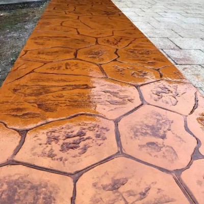 5、使用藝術地坪模具對地坪面層進行紋理處理。藝術地坪模具應配套使用,首先確定好紋理的分布方向,選好一塊模具放置的位置和角度,然后其它的模具依次緊貼一塊模具放置。彩色混凝土藝術地坪壓模采用壓模,壓模應由技術較好的人員進行作業以保證壓紋深度一致和模具放置的準確性。