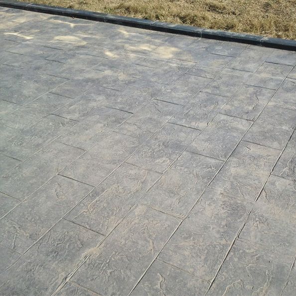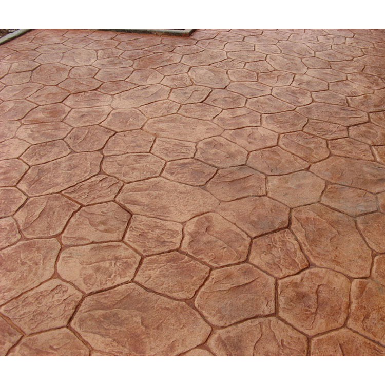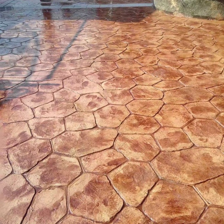 5、使用藝術地坪模具對地坪面層進行紋理處理。藝術地坪模具應配套使用,首先確定好紋理的分布方向,選好一塊模具放置的位置和角度,然后其它的模具依次緊貼一塊模具放置。彩色混凝土藝術地坪壓模采用壓模,壓模應由技術較好的人員進行作業以保證壓紋深度一致和模具放置的準確性。