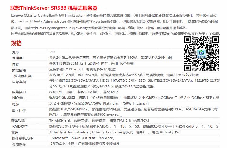 聯(lián)想服務器ThinkServer SR588 2U雙路機架式服務器主機(SR550升級款) 定制改配 2顆銀牌4210R【2.4G 20核40線程】 32G內(nèi)存/4x600G 10K/550W單電 |