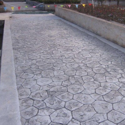 5、使用藝術地坪模具對地坪面層進行紋理處理。藝術地坪模具應配套使用,首先確定好紋理的分布方向,選好一塊模具放置的位置和角度,然后其它的模具依次緊貼一塊模具放置。彩色混凝土藝術地坪壓模采用壓模,壓模應由技術較好的人員進行作業以保證壓紋深度一致和模具放置的準確性。