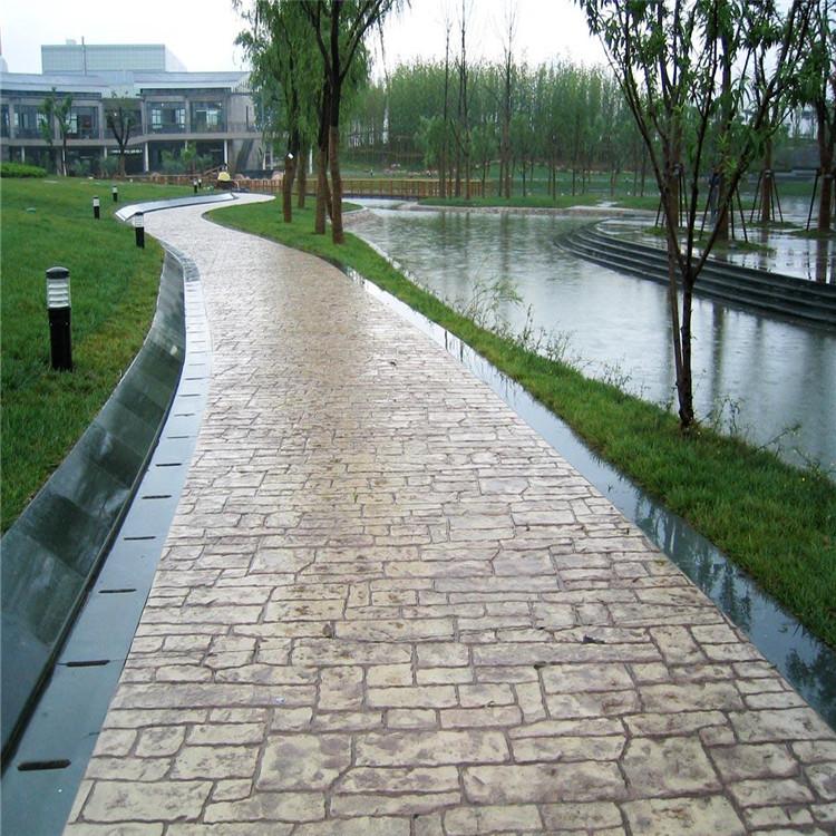 5、使用藝術地坪模具對地坪面層進行紋理處理。藝術地坪模具應配套使用,首先確定好紋理的分布方向,選好一塊模具放置的位置和角度,然后其它的模具依次緊貼一塊模具放置。彩色混凝土藝術地坪壓模采用壓模,壓模應由技術較好的人員進行作業以保證壓紋深度一致和模具放置的準確性。