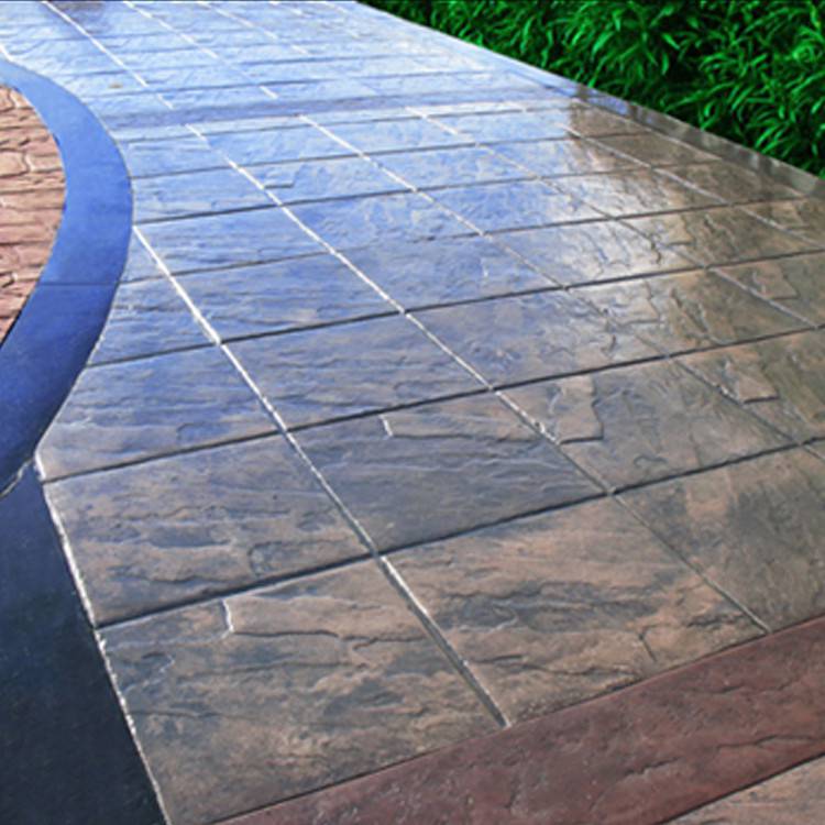 5、使用藝術地坪模具對地坪面層進行紋理處理。藝術地坪模具應配套使用,首先確定好紋理的分布方向,選好一塊模具放置的位置和角度,然后其它的模具依次緊貼一塊模具放置。彩色混凝土藝術地坪壓模采用壓模,壓模應由技術較好的人員進行作業以保證壓紋深度一致和模具放置的準確性。