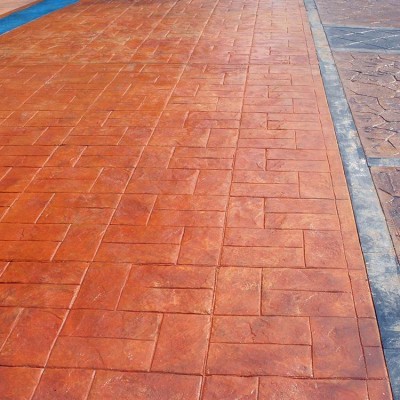 5、使用藝術地坪模具對地坪面層進行紋理處理。藝術地坪模具應配套使用,首先確定好紋理的分布方向,選好一塊模具放置的位置和角度,然后其它的模具依次緊貼一塊模具放置。彩色混凝土藝術地坪壓模采用壓模,壓模應由技術較好的人員進行作業以保證壓紋深度一致和模具放置的準確性。