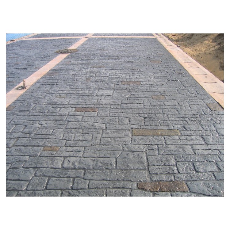 5、使用藝術地坪模具對地坪面層進行紋理處理。藝術地坪模具應配套使用,首先確定好紋理的分布方向,選好一塊模具放置的位置和角度,然后其它的模具依次緊貼一塊模具放置。彩色混凝土藝術地坪壓模采用壓模,壓模應由技術較好的人員進行作業以保證壓紋深度一致和模具放置的準確性。