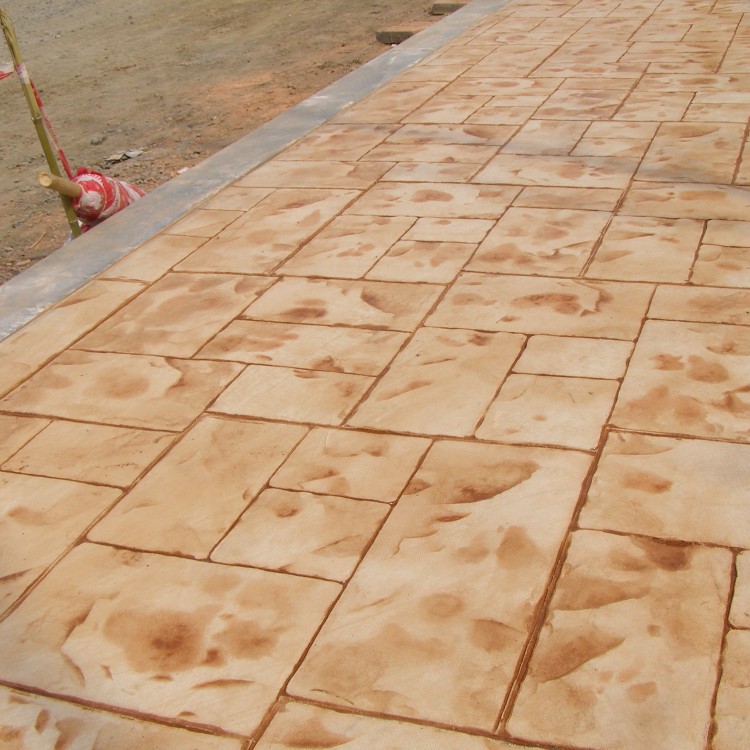 5、使用藝術地坪模具對地坪面層進行紋理處理。藝術地坪模具應配套使用,首先確定好紋理的分布方向,選好一塊模具放置的位置和角度,然后其它的模具依次緊貼一塊模具放置。彩色混凝土藝術地坪壓模采用壓模,壓模應由技術較好的人員進行作業(yè)以保證壓紋深度一致和模具放置的準確性。