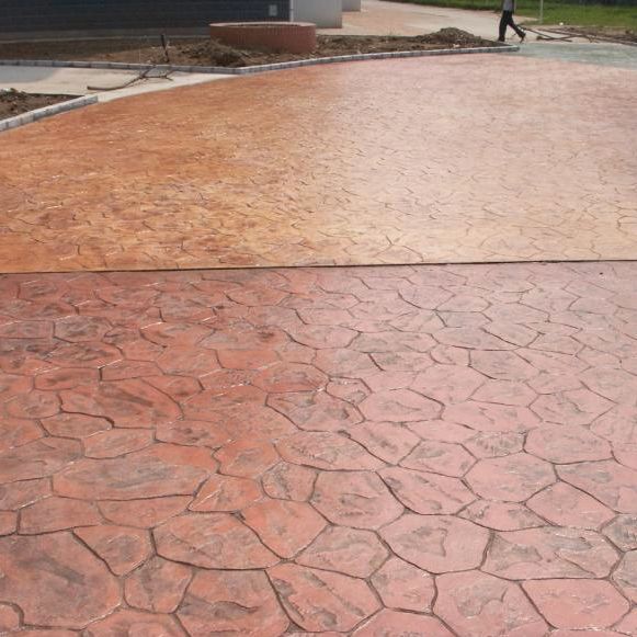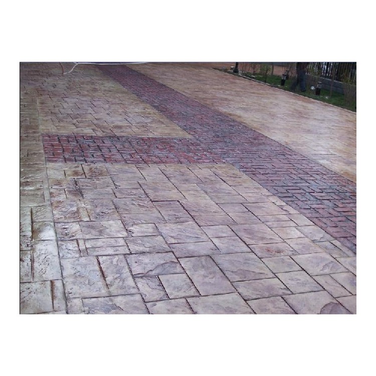 5、使用藝術地坪模具對地坪面層進行紋理處理。藝術地坪模具應配套使用,首先確定好紋理的分布方向,選好一塊模具放置的位置和角度,然后其它的模具依次緊貼一塊模具放置。彩色混凝土藝術地坪壓模采用壓模,壓模應由技術較好的人員進行作業(yè)以保證壓紋深度一致和模具放置的準確性。