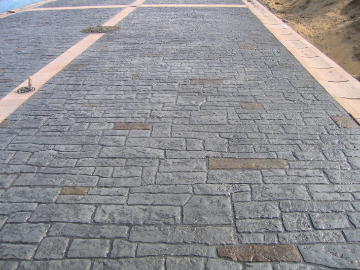 提漿收光 → 播撒強(qiáng)化料 → 精收光 →補(bǔ)強(qiáng)化料 →二次收光→撒脫模粉→用模具壓印地面→封閉道路→沖洗藝術(shù)地面→涂刷保護(hù)劑→完工