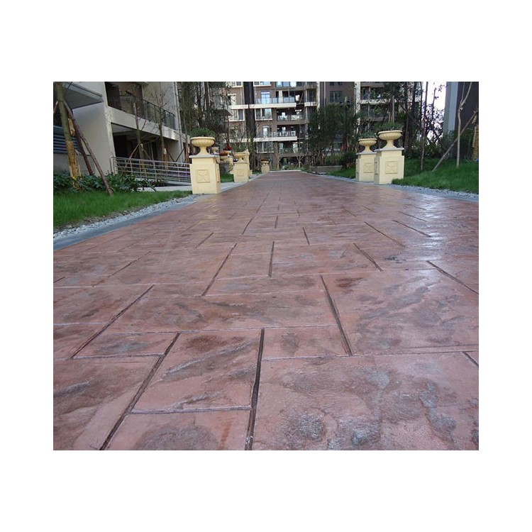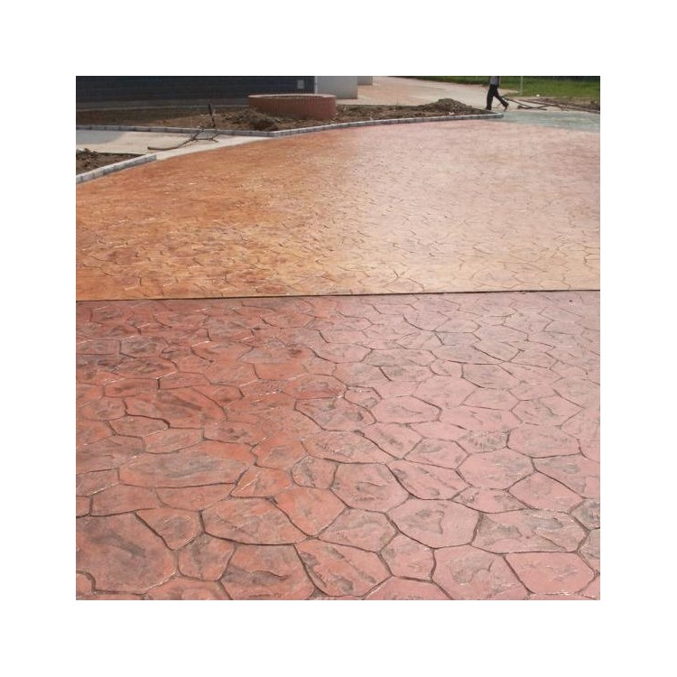 5、使用藝術地坪模具對地坪面層進行紋理處理。藝術地坪模具應配套使用,首先確定好紋理的分布方向,選好一塊模具放置的位置和角度,然后其它的模具依次緊貼一塊模具放置。彩色混凝土藝術地坪壓模采用壓模,壓模應由技術較好的人員進行作業以保證壓紋深度一致和模具放置的準確性。