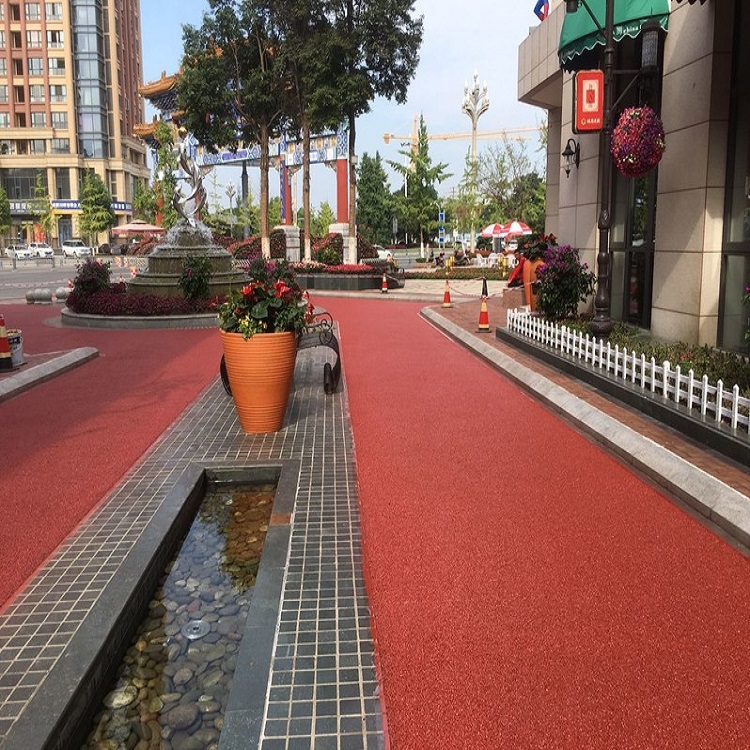 作為一種新的環(huán)保型、生態(tài)型的道路材料,該種透水路面面板鋪裝厚度根據(jù)巖性以及采用單粒徑巖石粒徑?jīng)Q定,一般厚度范圍在4~7cm。基層結(jié)構(gòu)可以采用半剛性基層或者是級配碎石、級配礫石透水基層,具有良好的透水性,是由聚氨酯膠粘劑與單級配或間斷級配骨料按一定配合比拌合而成的新型路面材料。目前該種材料主要用于鋪裝景觀道路等輕交通路面。
