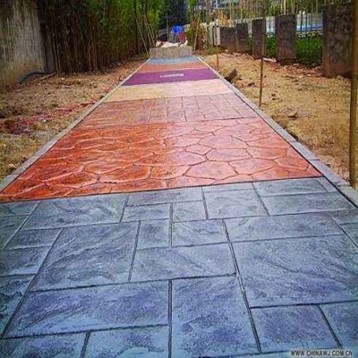5、使用藝術地坪模具對地坪面層進行紋理處理。藝術地坪模具應配套使用,首先確定好紋理的分布方向,選好一塊模具放置的位置和角度,然后其它的模具依次緊貼一塊模具放置。彩色混凝土藝術地坪壓模采用壓模,壓模應由技術較好的人員進行作業(yè)以保證壓紋深度一致和模具放置的準確性。