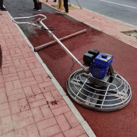 透水混凝土屬干性混凝土料,其初凝快,攤鋪必須及時。對于人行道面,大面積施工采用分倉方式進行攤鋪,其松鋪系數為1.1。將混合物均勻攤鋪在工作面上,用刮尺找準平整度和控制一定的泛水度,用抹刀抹平,抹合不能有明水。