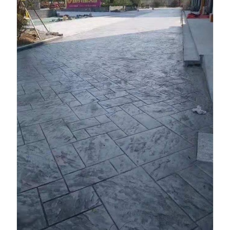5、使用藝術地坪模具對地坪面層進行紋理處理。藝術地坪模具應配套使用,首先確定好紋理的分布方向,選好一塊模具放置的位置和角度,然后其它的模具依次緊貼一塊模具放置。彩色混凝土藝術地坪壓模采用壓模,壓模應由技術較好的人員進行作業以保證壓紋深度一致和模具放置的準確性。