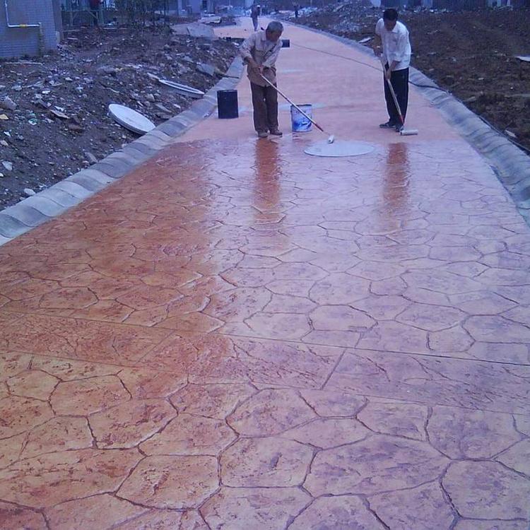7、理論上對(duì)藝術(shù)地坪封閉2-3天后進(jìn)行沖洗,正常情況下為了防止新造路面被污染,工程全部紋理壓印完成后統(tǒng)一進(jìn)行沖洗。沖洗時(shí)不必將脫模粉全部沖洗干凈,應(yīng)留有10%左右的脫模粉顏色,這樣的藝術(shù)地面就會(huì)有效果很好的漸變效果。