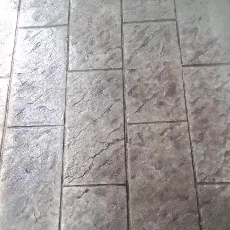 5.依照參照線壓模之后,迅速取出成型模并有條不紊地按順序壓完所有混凝土的表層。如果施工時遇到有靠墻、邊角或其它不規則處,可以使用壓模地坪邊角模,但使用時要注意與整體圖案的一致。